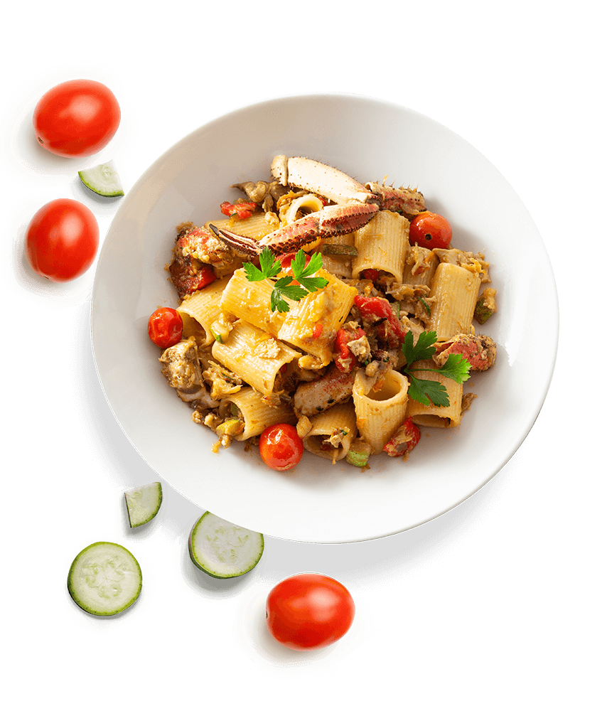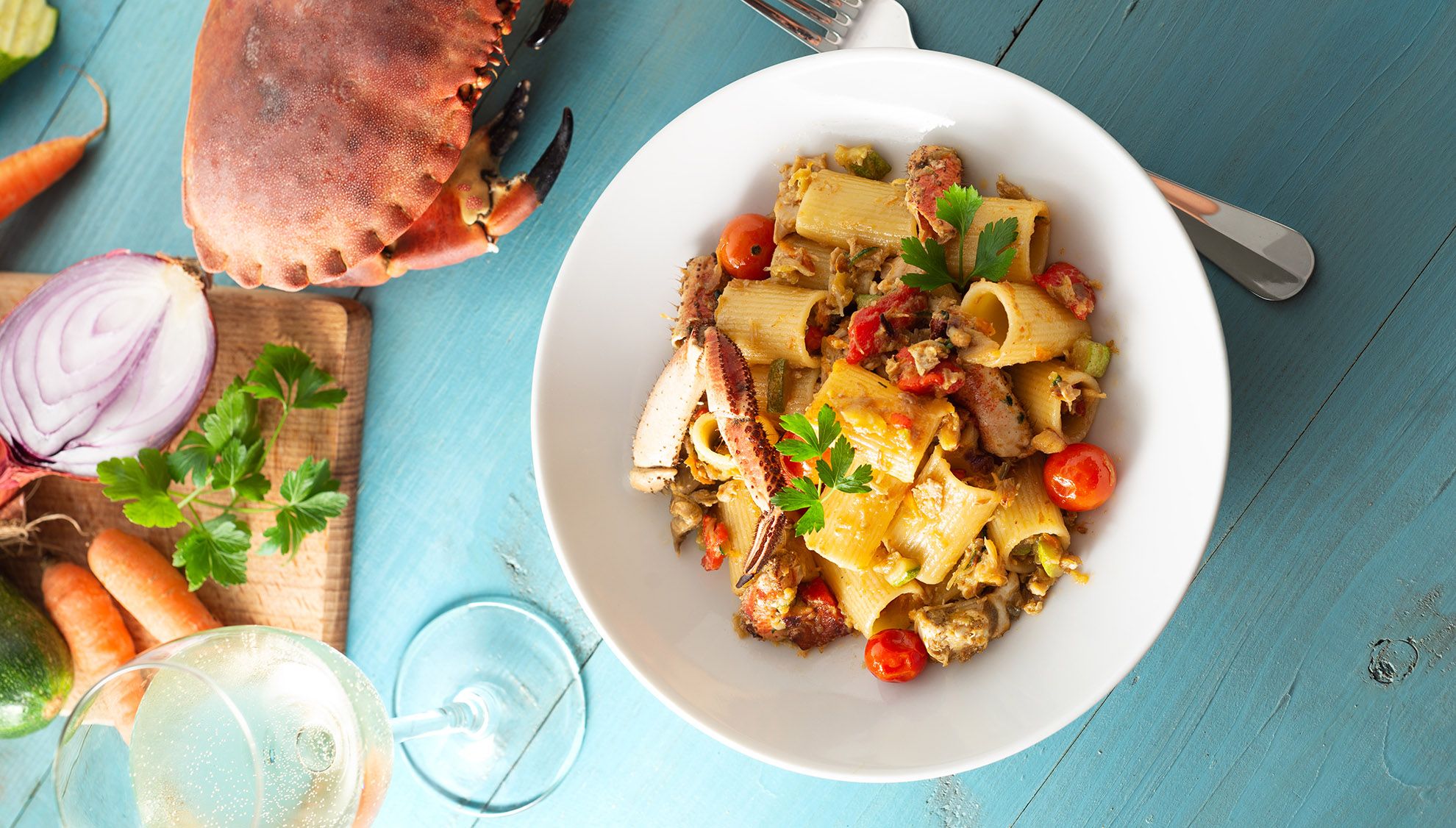 Per preparare le mezze maniche alla polpa di granchio iniziamo ponendo a bollire sul fuoco una pentola di acqua salata per cuocere la pasta. Nel frattempo prepariamo il condimento: in padella facciamo soffriggere l’aglio, poi aggiungiamo la polpa di granchio e facciamo rosolare. Sfumiamo la polpa di granchio con il vino bianco, poi aggiungiamo i pomodorini e dosiamo di sale e pepe. facciamo cuocere a fuoco medio-basso per circa 10-15 minuti. Cuociamo la pasta scolandola al dente e tenendo da parte un paio di mestoli di acqua di cottura. Saltiamo le mezze maniche in padella con il condimento a fuoco vivo e aggiungendo l’acqua di cottura per legare il condimento. Aggiungiamo (a piacere) un trito di prezzemolo fresco. BUON APPETITO!